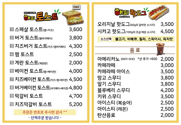 해피창업 토스트 10종, 핫도그 10종 조리 장비 설치 &출장 조리교육 500만원